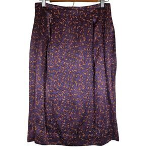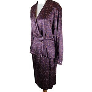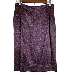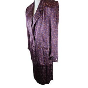 Gorgeous 100% silk skirt in a fun 80's 90's print fabric with purple, blue and gold. Fully lined interior, zippered closure in back. Has pockets on either hip. Excellent vintage condition. Top and blazer are sold separately.