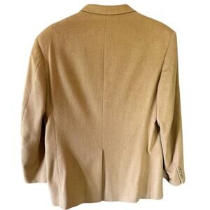Classic 2-button camel hair blazer in rich camel/tan. Notch lapels, welt chest pocket, flap hip pockets, center vent, 3-button cuffs, fully lined (acetate). 100% Camel Hair. Tag: 42R. Professionally dry clean.