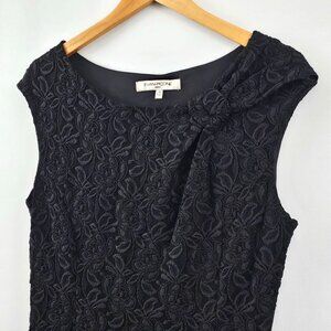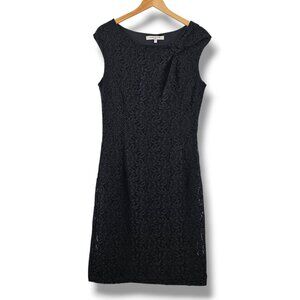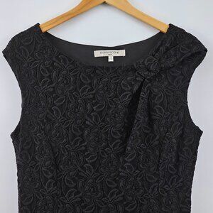 This Evan-Picone dress boasts a sophisticated floral lace design, ideal for formal occasions or professional settings. The sleeveless cut and bow accent provide a refined touch.
