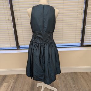 This elegant dark blue, tea length taffeta dress has a 1950s cocktail party vibe. The fabric and length makes this dress suitable for any formal or semiformal event.