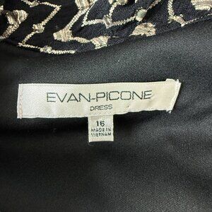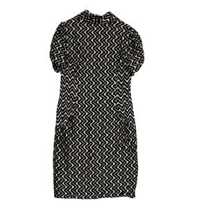 This Evan-Picone dress exemplifies sophisticated style with its zigzag pattern and elegant cowl neck. The knee-length design and short ruched sleeves offer a versatile look suitable for professional settings and social gatherings. The combination of black and gold colors enhances its classic appeal, making it a valuable addition to any wardrobe.