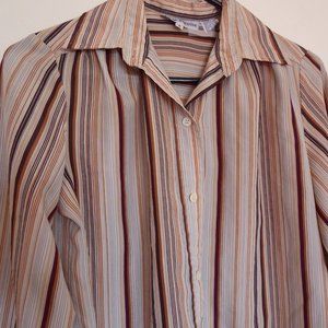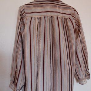 Vintage Evan-Picone blouse with brown, rust, grey stripes on cream base. Blouse is rather full in the body. Has a matching tie for tying into a bow. Can be worn with tie or open collar. 6 buttons down front, and button at wrist. Has a yoke across shoulders and top of back, then gathers below it which makes the bodice full and flowy!