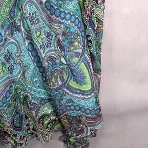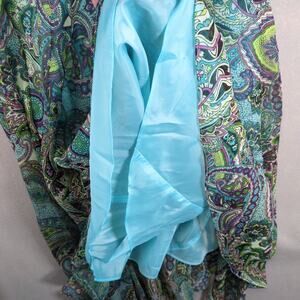* Features: Sheer overlay with inner lining, sleeveless, v-neckline, asymmetrical waist and hem, side zipper, light stretch. Paisley pattern in teal, purple, green, cream and navy.