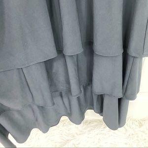 Evan-Picone black sleeveless tiered-skirt pullover dress with surplice v-neck and ruched waist. Cutaway sleeve.