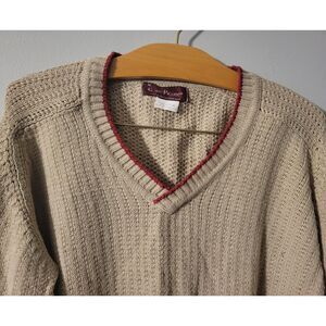 Evan-Picone Vintage Womens V-Neck Sweater Tan Red Trim