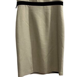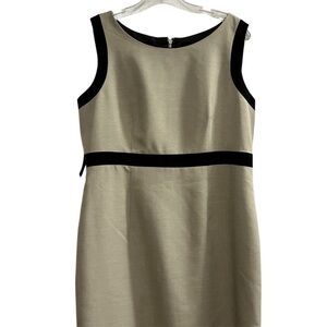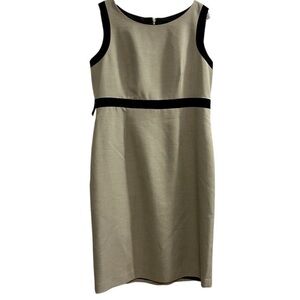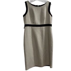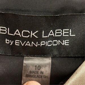 The Evan-Picone Black Label sheath dress is a knee-length, sleeveless garment designed for formal occasions. It features a round neckline and is made from polyester with a beige color and black trim. The dress is a size 10, regular fit, and is suitable for spring. It is a pullover style, machine washable, and manufactured in Bangladesh. The dress is pre-owned but in excellent condition. Keywords: Evan-Picone, sheath dress, size 10, beige dress, formal wear, sleeveless, knee-length, spring fashion, polyester, black trim.