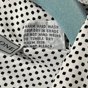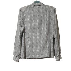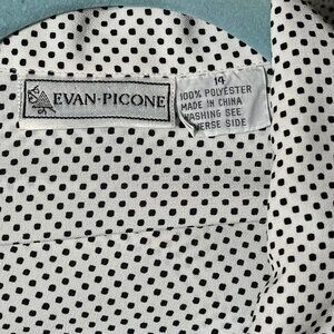This Evan-Picone blouse features a classic black and white polka dot design with a button-up front. Suitable for professional or casual settings.