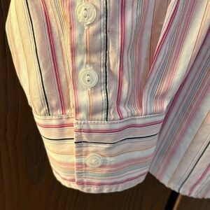 Evan-Picone long sleeved, tailored blouse. White with multi-colored stripes. 16W