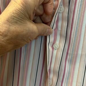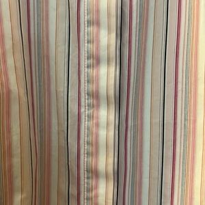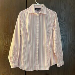 Evan-Picone long sleeved, tailored blouse. White with multi-colored stripes of red, black, pink and blue. Hidden buttons down the front. Size 16W.