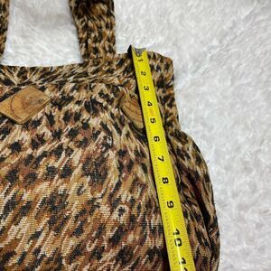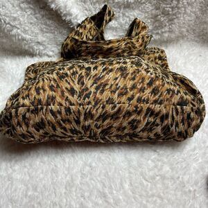 Evangeline ministry handcrafted cloth shoulder bag leopard prints wooden buttons three front pockets , two side pockets with elastic top snap closure the inside lining has three side pockets.pre owned in good used condition.M1