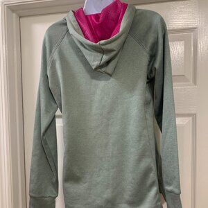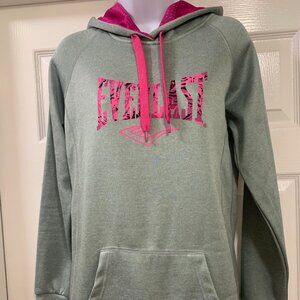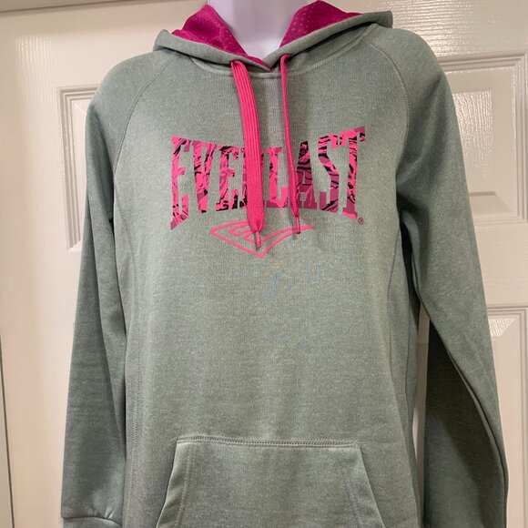 shiny silver pullover with hood and EVERLAST. 100% polyester, kangaroo front pocket