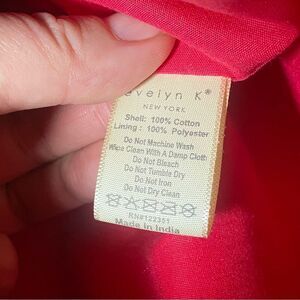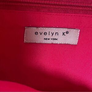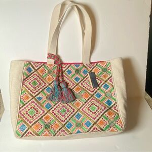 Evelyn K New W/Tags Embroidered Tote Bag. Excellent new condition. Off white woven cotton with front embroidered design. Top magnetic snap closure. Decorative hanging tassels. 2 straps with a drop of 10.5". Pink lining with one zipper and 2 slip pockets. Very small faint blue mark on bottom corner as shown in photo. Measures approximately length 12", width 16".