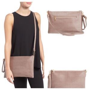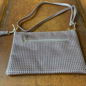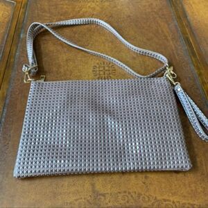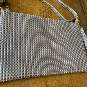 A metallic zip-top pouch elevated by a dynamic pyramid-stud texture features polished hardware and a well-organized interior. Carry this standout stylea as an elegant clutch.