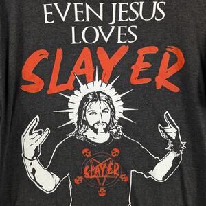 Graphic: "Even Jesus Loves Slayer" with metal hand signs and Slayer logo shirt