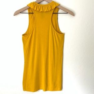 Even Ruffle Neck Racerback Top - Size S. Color: Yellow. Made in China. Fabric Content: 95% Viscose, 5% Spandex. Care Instructions: Hand Wash Cold. Dry Flat. This marigold top adds a pop of sunshine to your look and is perfect for the spring and summer seasons. The knit fabric is soft and stretchy. As for details, the ruffle neckline adds a feminine touch, while the racerback design creates a casual vibe.