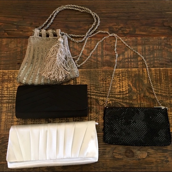Set of 4 adorable evening bags. All have straps or can be used as clutches (except the beaded pouch). 2 of the 4 are NWT. 2 are black, 1 is silver and the beaded pouch is a golden gray