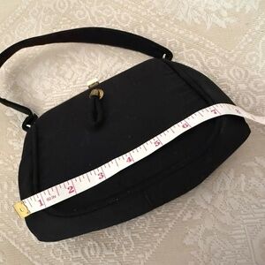 This Vintage Hand Bag is rare. Grosgrain on the inside & outside with one zipper pocket inside. The handle has a 4" drop. 8" wide x 5" tall x 3" wide. Gold toned hardware.