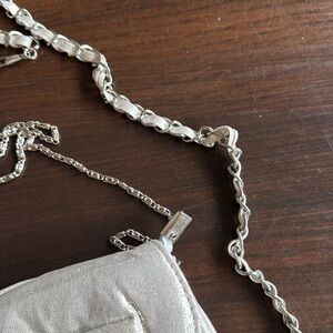 Well, look at this little Y2K sweetie. I just love the giant brooch on the front, the silver and it comes with two different straps so you can decide if you want that braided chain one or just the tiny metal strap. It’s perfect for a wedding and cocktail party, you name it.
