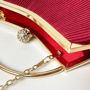 Features: Sparkly champagne glitter fabric with a stylish pleated front design. Easily switches from clutch to shoulder bag or crossbody with the detachable chain strap. Compact enough to hold your phone, wallet, cosmetics, keys, and glasses. Elegant circular diamond-encrusted latch adds a luxe touch.