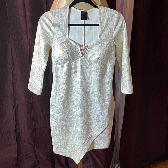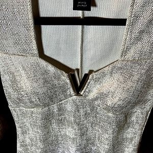BEAUTIFUL ivory/cream color and gold metallic design. Gold V shaped hardware does not accentuate the area but rather decorate. Pretty and sweet for teenager for sassy amd classy young lady. Asymmetrical front hem. 95% polyester 5% spandex