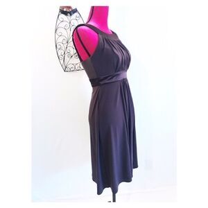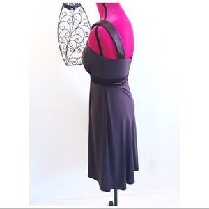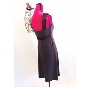 Awesome brown knit evening gown. High satin collar leaving bare shoulders. Small peek a boo opening in bodice and satin waistband.