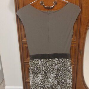 Beautiful silky brown, silver, and green cocktail dress has brown satin ribbon across the waist. This size 2 dress is from Saks Fifth Avenue, and has only been worn a few times.