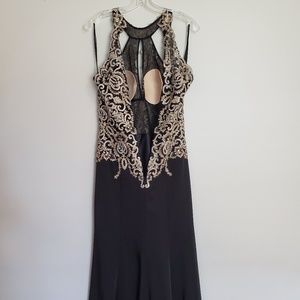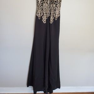 Jovani Evening Gown. Long black halter gown with gold lace on top. Brand new, never been worn. Comes with tags and clothing bag. From Castle Couture.