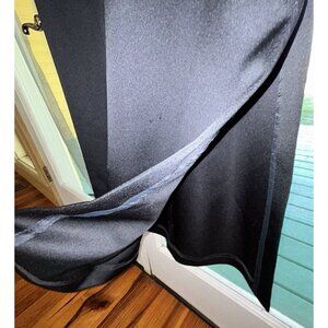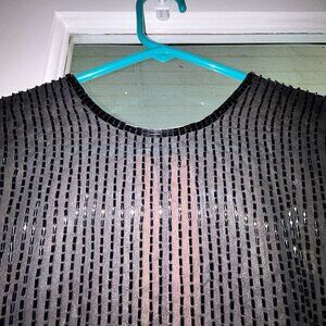 Evening Gown Long Black Beaded Bodice and Fringe, Sleeveless Dress Women’s Size 8-10. Side Slit 20". Sheer see through top. Black glass beaded bodice with black bead fringe along bottom of bodice. Lower part of dress is polyester to the hem. No lining. Zipper back. Formal, party, New Years Eve, Corporate, Prom, Wedding, Holiday, Fancy. Dry Clean Only.