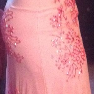 Floor length Evening Gown w/floral hand painted design w/ glitter, crisscross string in back, pink nylon lining under dress. Brand New never wore. Closed boutique l