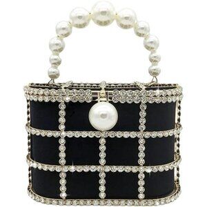*This exquisite Boutique De FGG, crystal bucket evening clutch bag looks absolutely stunning. Made of high quality hollow metal ,covered with sparkly diamonds on the surface.The handle of the handbag is decorated with beaded pearls,it looks chic and elegant., the bag also features a giant pearl on the magnet clasp. The smooth satin fabric lined interior and well-selected hardware that's plated with aluminum-free K-Gold complete the elegant look
