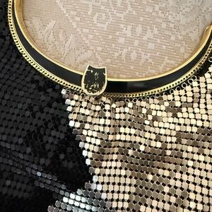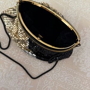 Please note 2 defects shown in photos. The clasp is scratched & the lining is loose in one spot. The colors are black, silver and gold so it can be work with any outfit. Snake style strap has a 19.5" drop. Bag is 6" high & 9" wide.