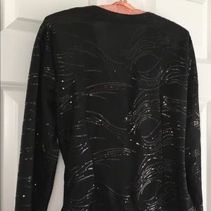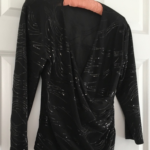 A lovely evening top to wear with slacks or skirt. Has a cross section that is gathered and a nice neckline with tiny sequin