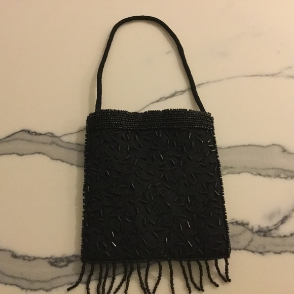 Small evening bag Black in color Black sequins on one side One side plain Approximately 5” x 5”