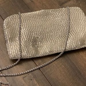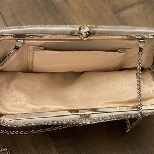 Prom is here !!! Metallic evening bag sure to catch eyes. Fully beaded silver clutch. Fully lined with a removable chain strap and rhinestone clasp. This evening bag is perfect for your wedding, sweet 16, Prom or any other formal occasion. Or maybe you just want to jazz up a casual look with some glam ! This bag won’t disappoint.