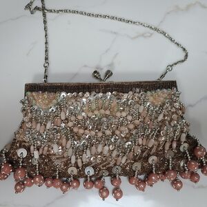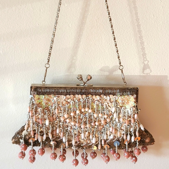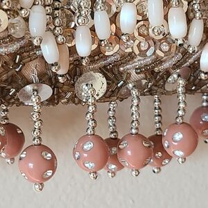 Beaded and sequined purse with silver chain shoulder strap. Silver sequins with peach and cream color beads. Gold colored satin lining.