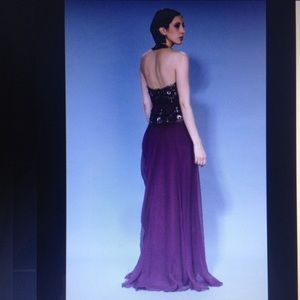 Halter neck evening dress. Body: 100% silk chiffon with gold leather and French beaded lace details at waist and chest. Made in USA from imported fabrics. Original design by Daniela Vlad.