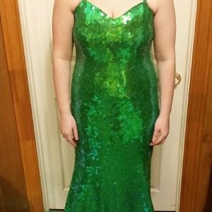 The dress is stretchy and can expand significantly without distortion. it is fully covered in liquid sequins and has a beautiful train.