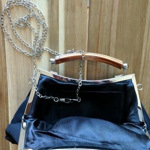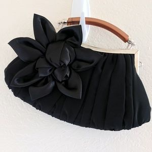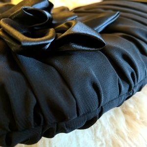 Never been used. This black purse has ruched/pleated material outside w/ black satin bow detail on one side. The interior includes one slip-in pocket and ample space to hold your things.