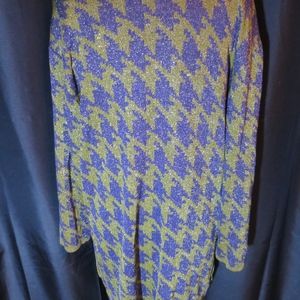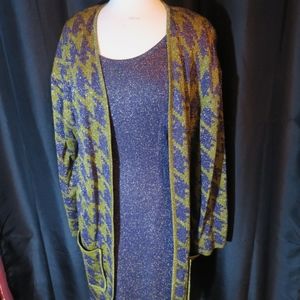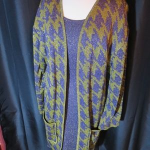 Metallic knit evening suit (dress & jacket). Patch pockets on jacket and chain straps on dress.