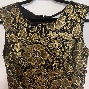 Sleeveless gold lace overlay cocktail dress. Full black lining. Jewel neckline. Zipper back. Measures approx 43” from shoulder to hem. Armhole to armhole measures approx 17” lying flat across the front. Beautiful, like new condition. Worn only once.