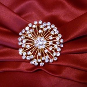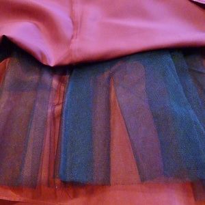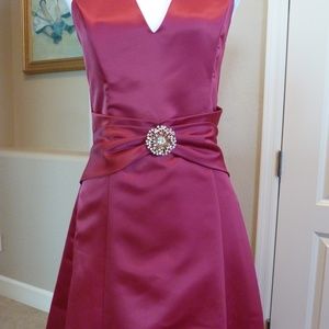 Formal Dress, Deep Red. (pic #4) Great condition, worn once. Sz 7/8. Jessica McClintock for Gunne Sax. Ties at the back of the neck, zip closure, Rhinestone Starburst pin at waist front, crinoline between skirt and lining for shape. Boning in the bodice seams for shape. Very minor mark at arm pit. 100% Polyester. Dry Clean.