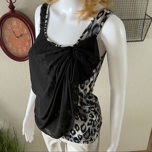 Still like new animal print , sleeveless, top with black chiffon overlay on front with bow on one shoulder. Fabric is stretchy, blouse