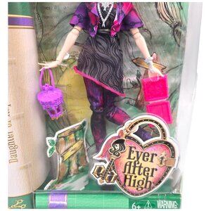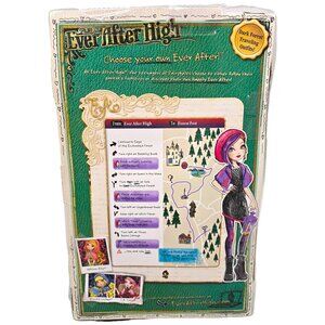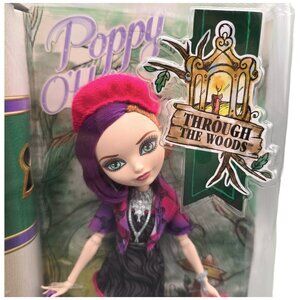 This Ever After High Poppy O'Hair Doll features the beloved Daughter of Rapunzel character. Part of the "Through The Woods" series, it includes a doll, story booklet, doll stand, and accessories. Packaged in a book-themed box, this doll makes a charming addition to any collection.