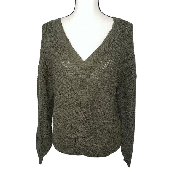 Ever B Green Sage Knit Fall V Neck Lightweight Knotted Sweater NWOT