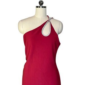 Deep red scuba like fabric with stretch. Crystal one shoulder neckline, sheath silhouette, fully lined, back zipper.