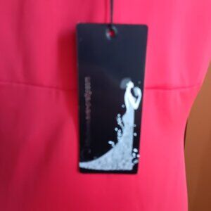 18 pit to pit, 34 top strap to hem, 18 hip, stretch polyester