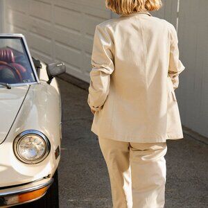 Tailored 2 button blazer inspired by timeless men's suiting. This 6.9 oz. cotton blend suiting twill is garment washed for a luxuriously soft feel and constructed with hand-linked seams. Details include two besom flap hip pockets, a welt breast pocket, one internal welt chest pocket, and a notched lapel. We left it unlined and ommitted the back vent and cuff buttons for a modern, streamlined look.