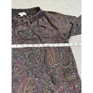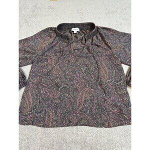 Evereve Kyra paisley blouse in good pre-owned condition. Colors are perfect for fall with brown, green and pink. Smocked v neck neckline with ties. Lightweight flowy fabric. Please see pictures for measurements and condition.