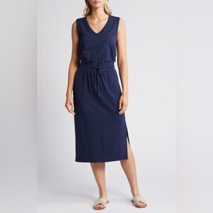Evereve Elastic Waistband Drawstring Navy Blue Midi Dress size medium