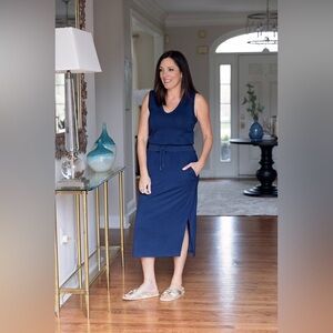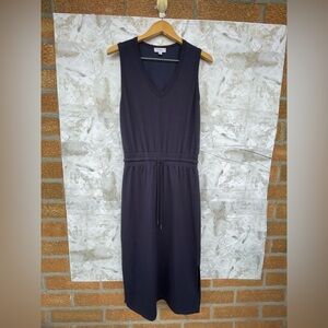 sleeveless midi dress v-neckline elastic waistband with drawstring slit at hem stretchy in excellent condition.